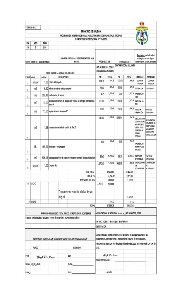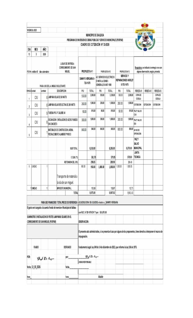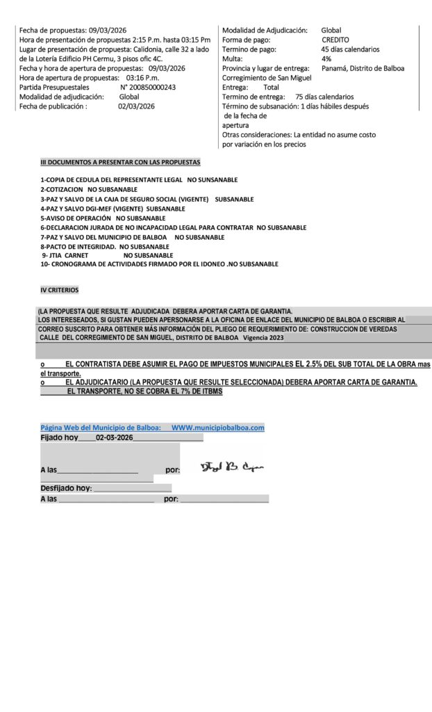 AVISO DE CONVOCATORIA N° 024-2025 SUMINISTRO DE MATERIALES PARA UNIDADES DE VIVIENDAS DISTRITO DE BALBOA, Vigencia 2025. ADJUDICACION del Suministro de materiales para unidades de viviendas AVISO DE CONVOCATORIA N° 001-2026 MEJORAMIENTO DE VEREDA CALLE EN EL CORREGIMIENTO DE SAN MIGUEL, DISTRTITO DE BALBOA Vigencia 2023. ADJUDICACION Construccion de vereda calle en el corregimiento de San Miguel, Distrito de Balboa vigencia 2023 ADJUDICACION SUMINISTRO E INSTALACION DE POSTE LAMPARAS SOLARES EN EL CORREGIMIENTO DE SAN MIGUEL DISTRITO DE BALBOA vigencia 2025 PIOPSM